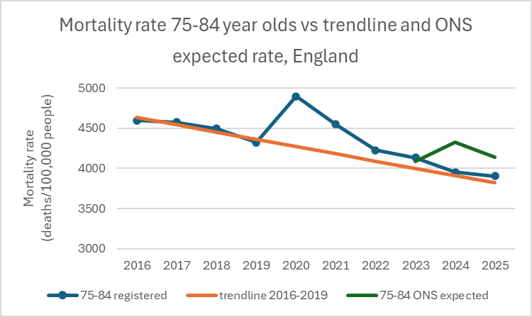 The same applies to those aged 75–84. The ONS expected death rate for this group in 2024 was high, with only a modest downward correction for 2025. In contrast, the actual data returned to trend more quickly.