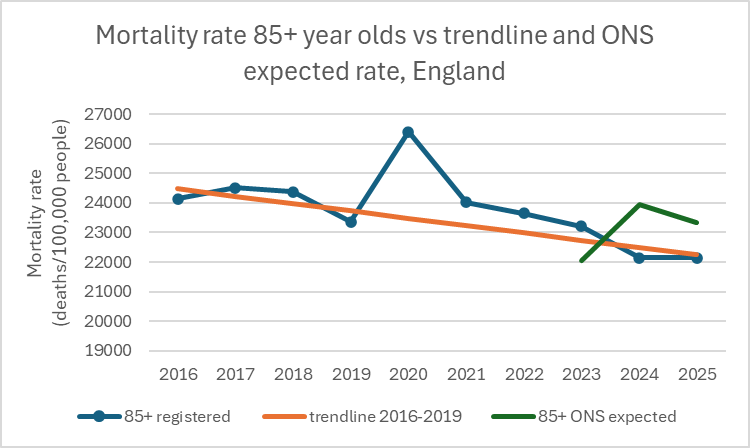 There is no indication of that pattern here. The mortality rate for over-85s in 2025 is close to its 2016–2019 trend. The most likely explanation is that there are additional causes of mortality making up the difference.