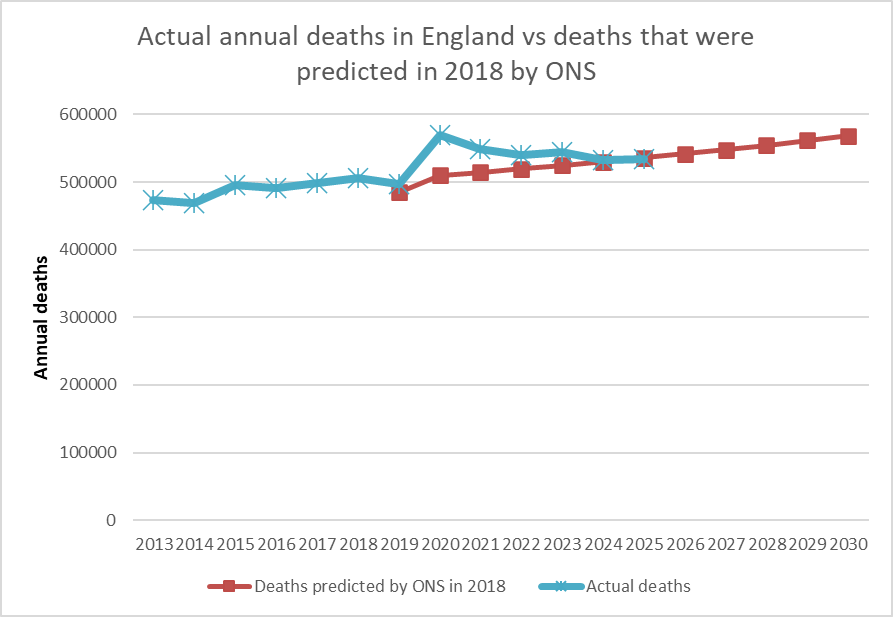 The 2025 death registration data for England is now available. It offers a chance to revisit a benchmark: the ONS 2018 population and mortality projections, published before the pandemic, before lockdown, and before any changes in methodology.