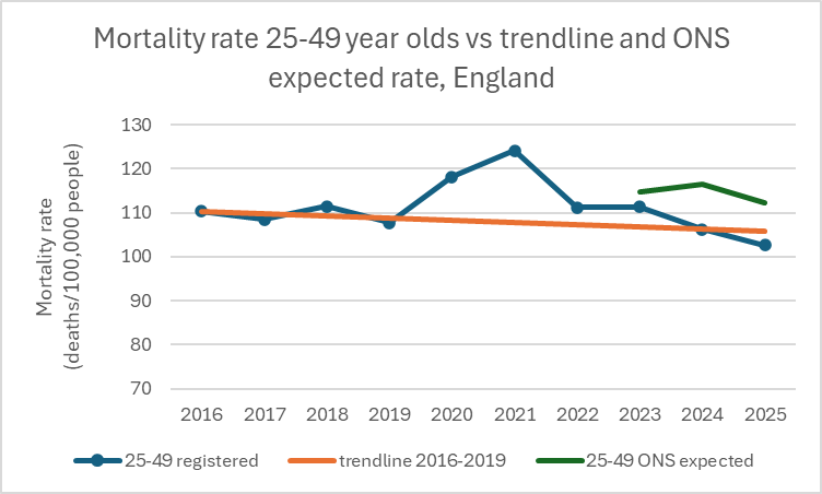 Figure 6: Mortality rate for 25-49 year-olds vs trend and ONS expected rate