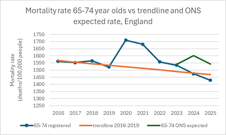 Figure 4: Mortality rate for 65-74 year-olds vs trend and ONS expected rate
