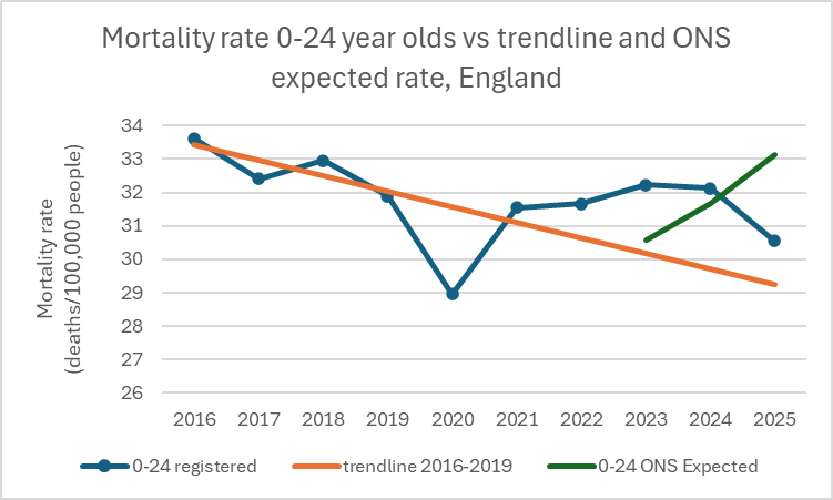 Figure 7: Mortality rate for 0-24 year-olds vs trend and ONS expected rate