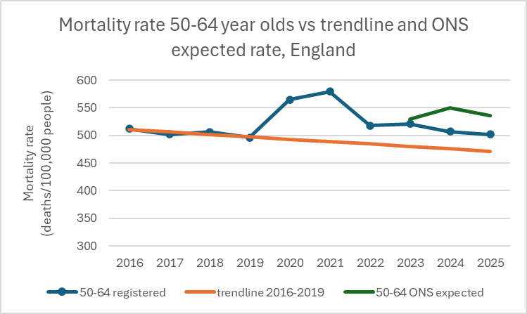 Figure 5: Mortality rate for 50-64 year-olds vs trend and ONS expected rate