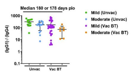 Figure 2: Results from Singapore study showing ratios of protective and tolerant IgG classes in mild and moderately infected unvaccinated people and mild and moderately infected vaccinated people with breaththrough infection