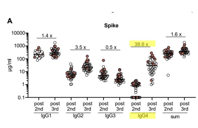 The first such paper on the matter entitled “Class switch towards non-inflammatory IgG isotypes after repeated SARS-CoV-2 mRNA vaccination” was published as a pre-print by a German group as long ago as July 2022, and can be found here.