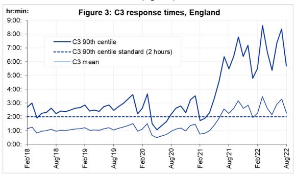 The UK was also seeing cardiac problems with 20,000 more cardiac or respiratory arrest calls in 2021 than 2019 and 14,000 more than in 2020. The increase began in spring 2021. Ambulance response times in England rocketed from spring 2021 and have remained abnormally high since (see figure 5). The vaccinated have been shown to have a considerably higher hospitalisation rate for non-covid causes than the unvaccinated. While this may be partly because the healthiest declined vaccination the difference is stark enough to warrant investigation.
