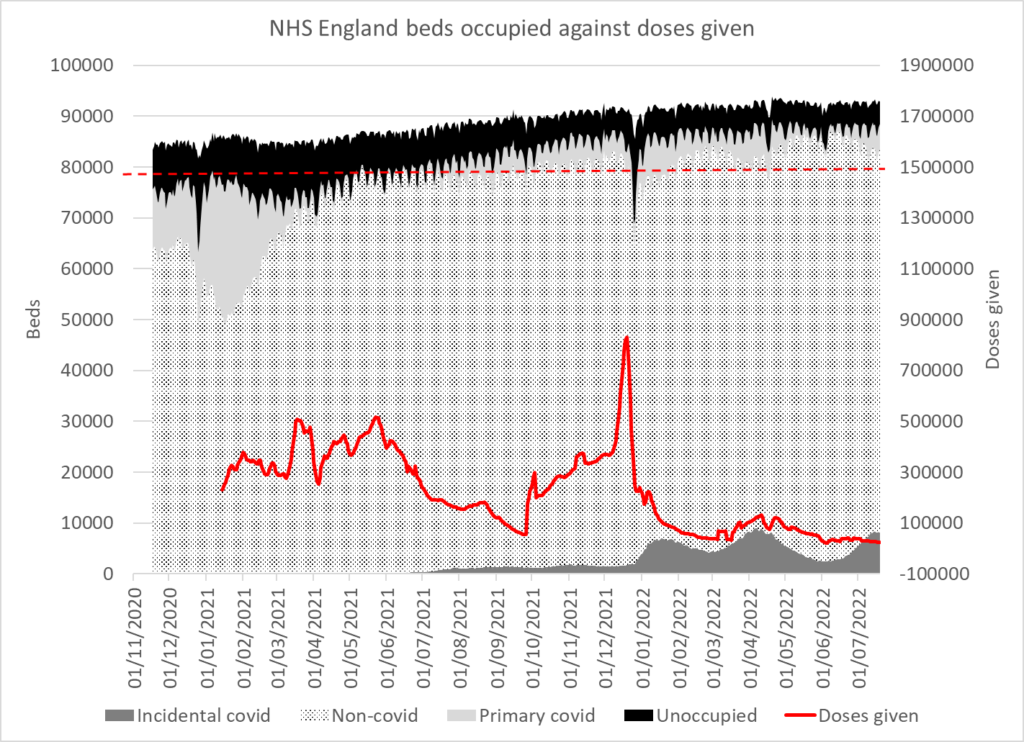Up to December 2021, the UK and Australia had a very different covid trajectory (see figure 2). England had seen waves of hospitalised patients testing positive but overall hospital bed occupancy remained flat. The first wave had no consequent impact on non-covid hospital admissions. However, from spring 2021 the total number of patients in hospital steadily rose until by spring 2022 there were more patients in hospital beds than the entire capacity within the NHS for winter 2020/21.