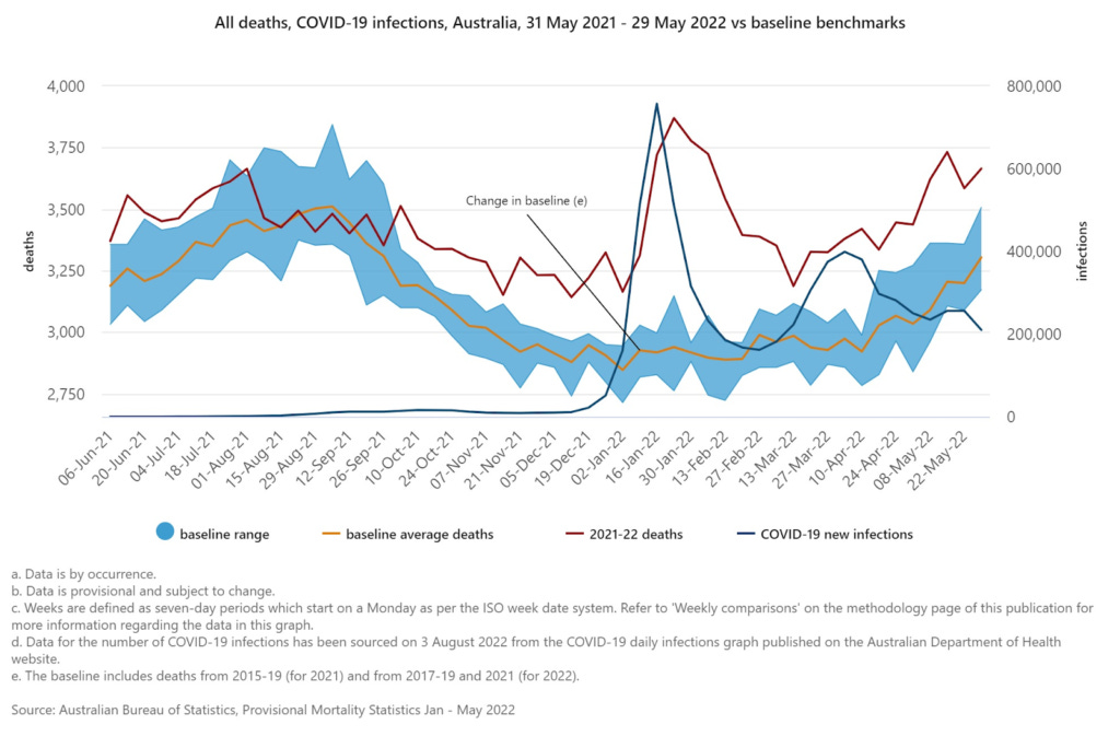 An ageing population means that more deaths might be expected over time, and a baseline which does not account for this can lead to erroneous conclusions about the death levels being observed. Life insurers are best placed to estimate expected deaths and the Australian Actuaries Institute (the body that represents the Australian actuarial profession) estimated that there were 3,200 extra unexplained non-covid deaths in the first four months of 2022, which is about half of those deaths that exceeded expected levels.
