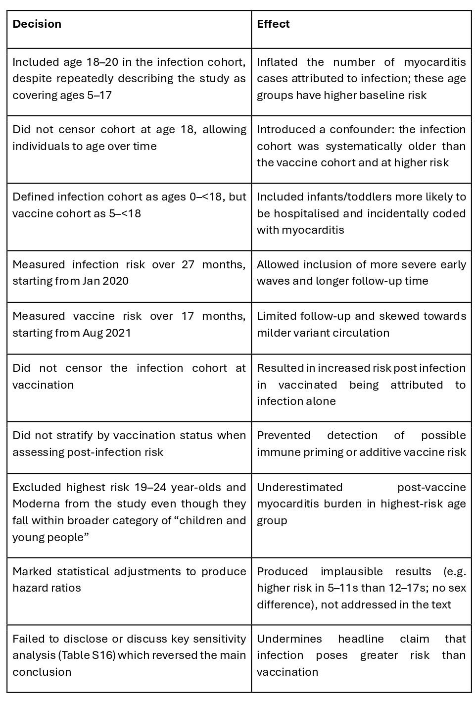 The direction of bias throughout the study is consistent. Key methodological decisions systematically inflated the risk of myocarditis attributed to infection and reduced the apparent risk after vaccination. A summary of these decisions is attached. Overall around three quarters of the cases after an infection would not have been included in a fair assessment.