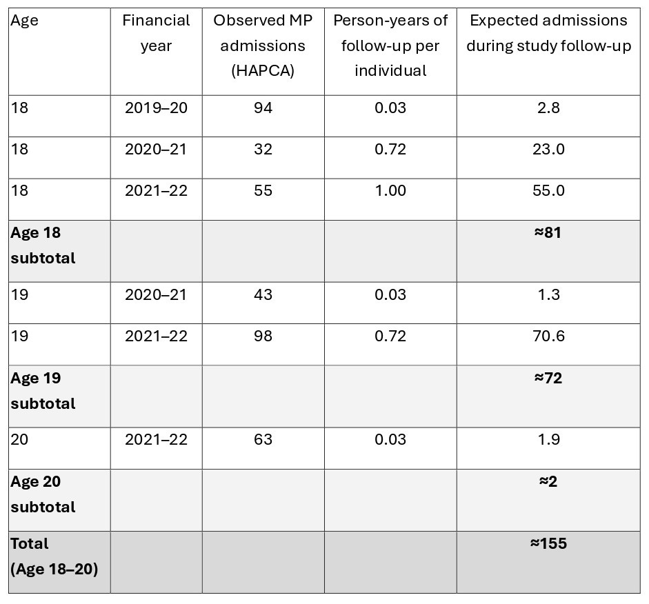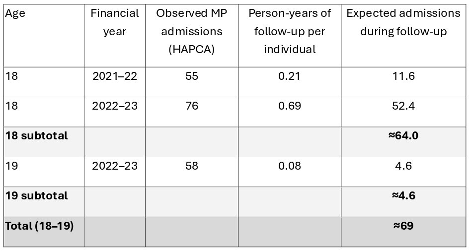 Table 2: Infection cohort. Estimated number of myocarditis/pericarditis admissions aged 18-20 years, during study follow-up, as a result of failure to censor at age 18, accounting for age-specific person-years of observation.