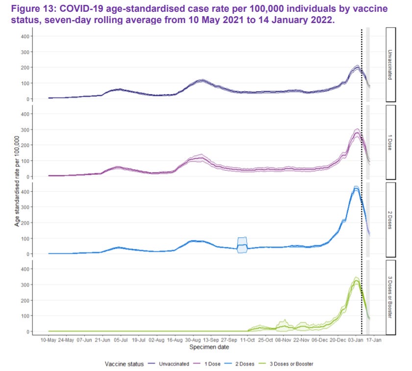 Data from Scotland suggests that the same increase in incidence in the first two weeks after vaccination was seen with the booster vaccinations as with doses 1 and 2. The two week danger period cases are counted as cases in the double dosed population and only after 14 days are people considered to have had their booster injection. The result for Omicron was that the case rates were a third higher for the double dosed population than for the single dosed or triple dosed. (The lower rates in the unvaccinated may also reflect both a higher proportion of people with naturally acquired immunity and a lower propensity to test).