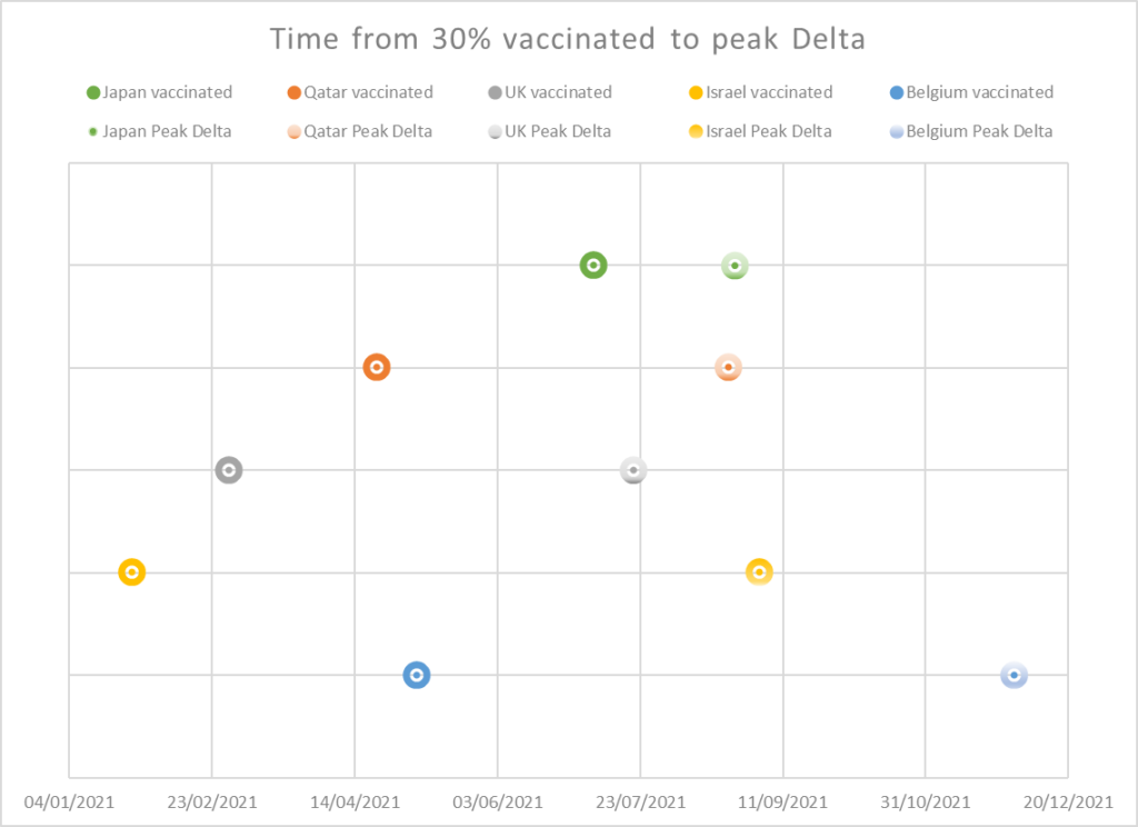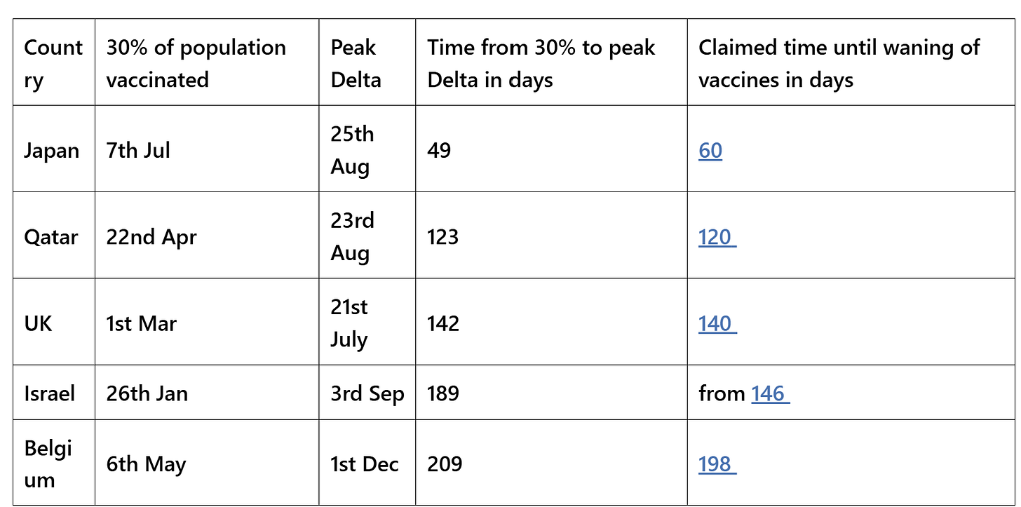 Table 1: Comparison of time between vaccination rollout and next variant wave and estimated time at which waning occurs Ref Japan, Qatar, UK, Israel, Belgium